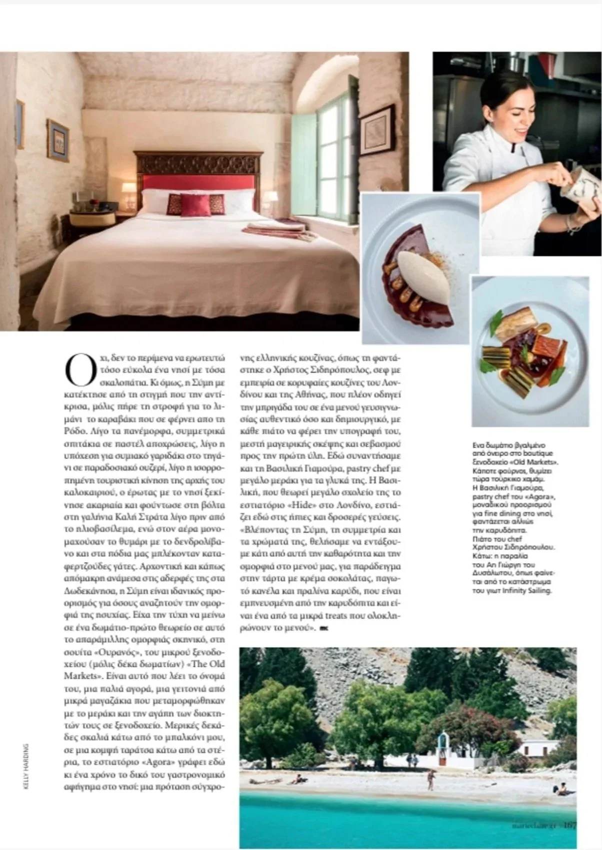 Thalia Tsichlaki traveled to Symi to sample the cuisine of chef Christos Sidiropoulos at the fine dining restaurant Agora. She also records her impressions of the island itself and her unforgettable stay at the very special boutique hotel The Old Markets.